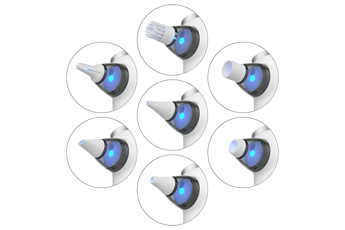 Der weiche Silikon-Aufsatz ist gepaart mit den in 2 Ringen angeordneten weichen DuPont Tynex Borsten. In Sonic-Schwingungen versetzt können sie in alle Richtungen bewegt werden. Mittig ist der Absaug-Kanal angeordnet. Die Schwingungen der Bürsten-Aufsatz-Düse und die Saugleistung lösen das zuvor pulverisierte Cerumen und die Schmutzreste vom Hörsystem.
