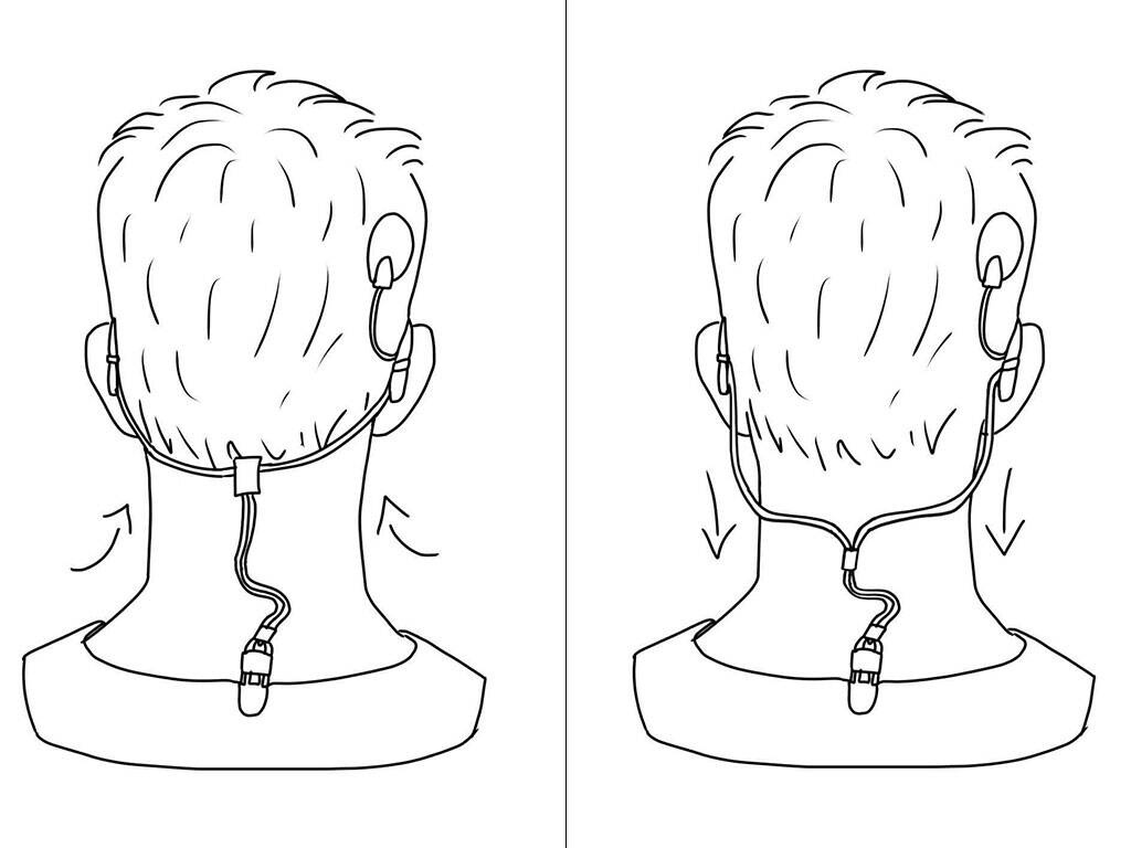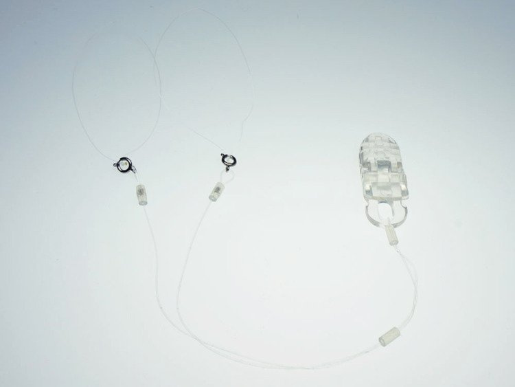 A double clip-on hook is made of a thin 0,6mm silicone line, a plastic clip and a spring ring clasp connecting the line with the loop. A special line loop allows it to be hooked into the audio processor or other protected hearing device. The hook can fit various devices such as All-in-one / OTE audio processors or other hearing devices with the possibility of hooking the line. The hook is subtle and unobtrusive.