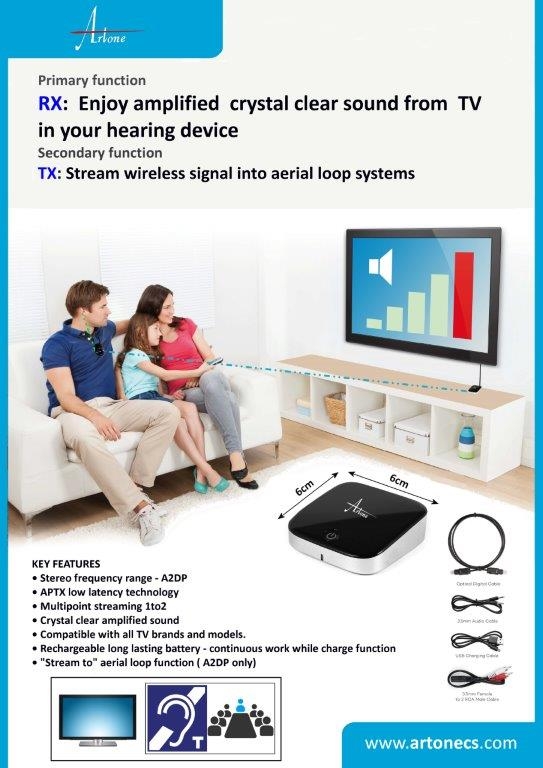 Television transmitter that enables clear sound transmission from your television, directly into the hearing aid or implant, without any surrounding noise or interference. Hear every word from the TV loud and clear in your hearing aid or implant, while others continue listening to the TV speaker at their hearing level. Compatible with Artone wireless streamer and any hearing aid or implant equipped with T-Coil.