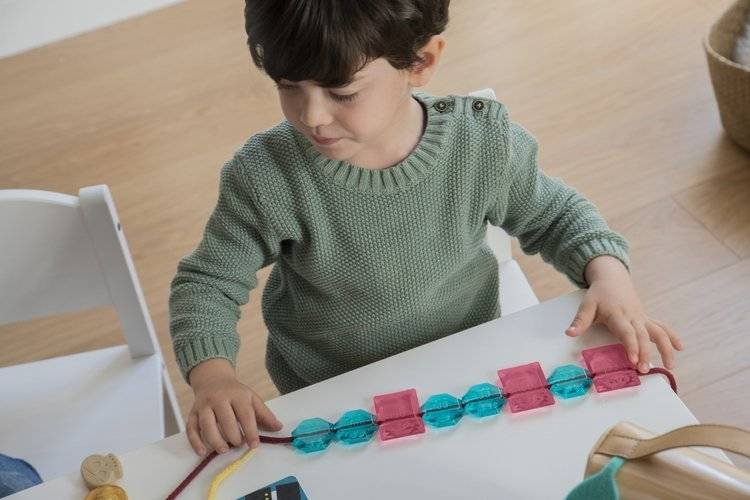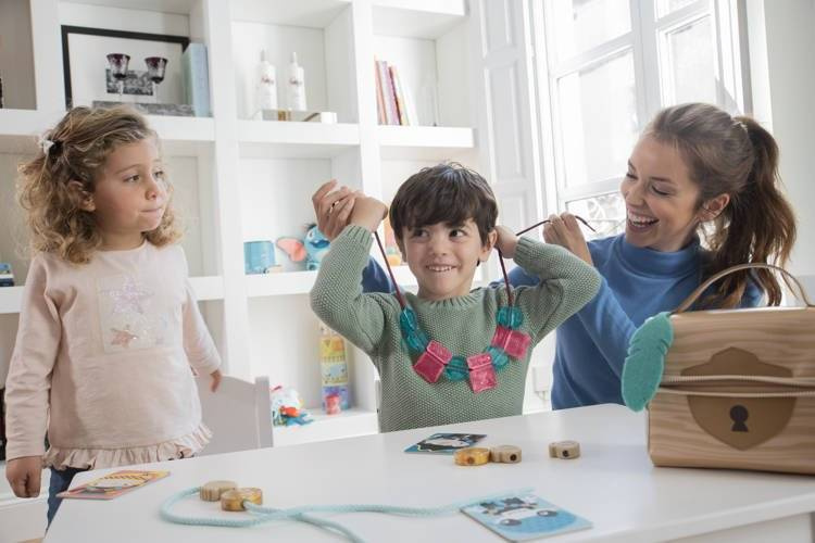 Permite jugar individualmente o de forma colectiva ya que incluye cordones coloridos y de gran grosor con el que los peques podrán formar hasta 4 collares a la vez.