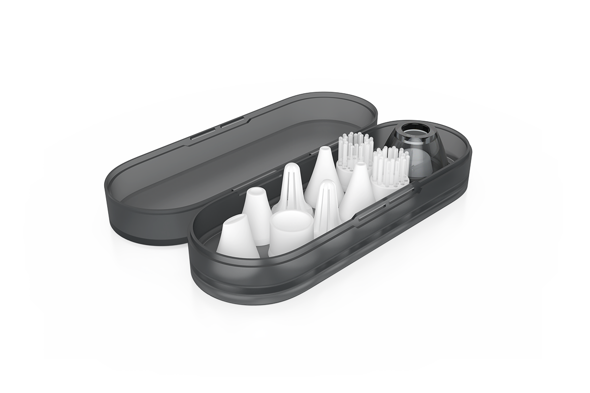 The soft silicone attachment is paired with the soft DuPont Tynex bristles arranged in 2 rings. Set in sonic vibrations, they can be moved in all directions. The suction channel is in the center. The vibrations of the brush-nozzle and the suction power remove the previously pulverized cerumen and dirt residues from the hearing aid.