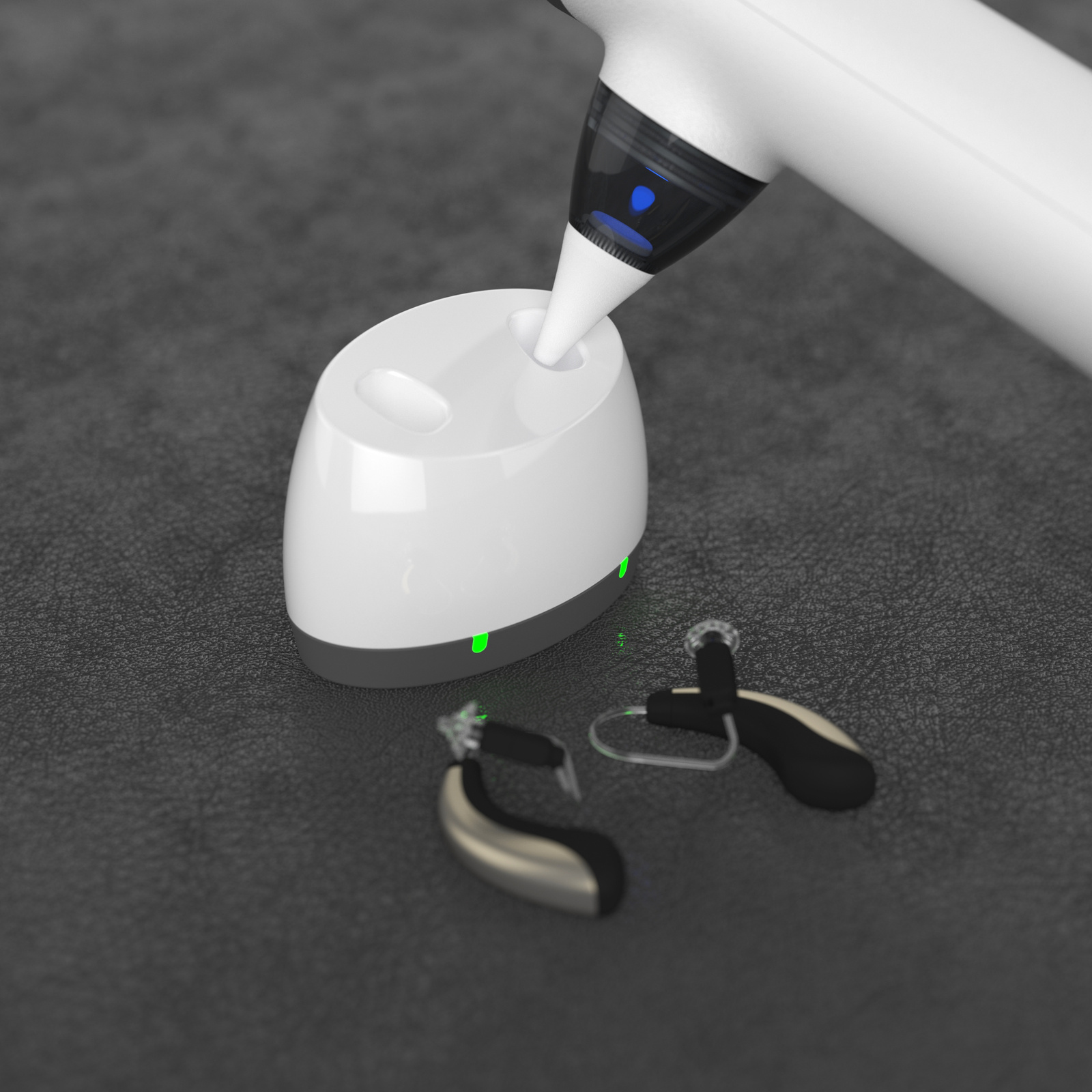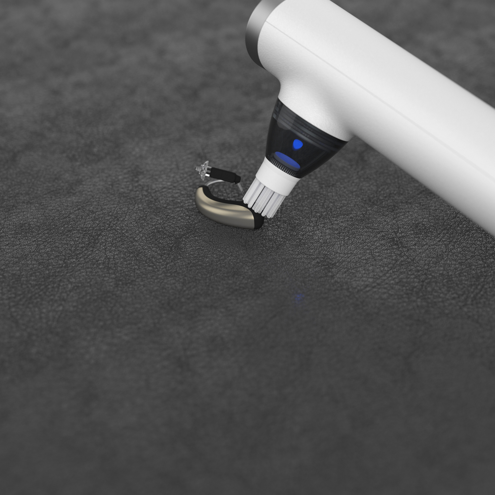 Hearing aids that are perfectly dried with turbo-fan drying can be easily cleaned with the vac-clean uv® and brush-nozzle. Adhering cerumen and dirt are pulverized and removed and sucked up by the movement of the brush attachment nozzle over the hearing aid housing, which is performed with uniform pressure. The sonic vibrations of the soft brush rings support the cleaning process.